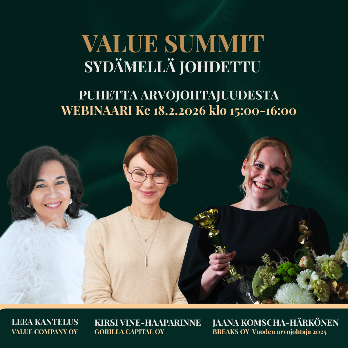 Visiomme on nostaa esiin arvojohtajia sekä antaa tunnustusta konkreettisista arvoteoista. Value Summit -kampanja myöntää vuoden 2025 Arvojohtaja ja Arvoteko -tunnustukset marraskuussa 2025. Ehdokkaiden ilmiantoja annettiin ajalla 1.4.-30.9.2025. Semifinalistit valittiin lokakuussa ja finalistit marraskuun alussa. Tunnustukset jaettiin Value Summit 2025 -arvogaalassa 15.11.2025 Bottalla Helsingissä.